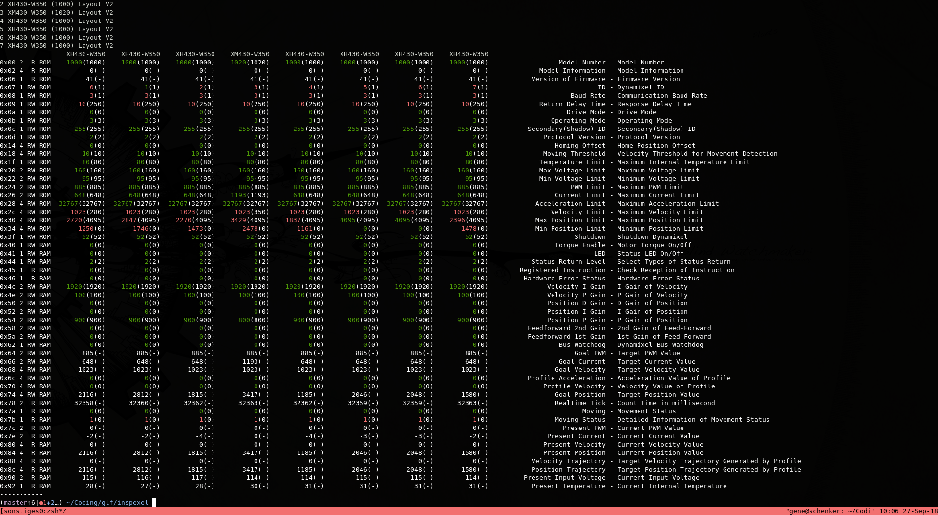 This software’s purpose is to have a command line tool to configure dynamixel motors. Dynamixel motors are being used in many robotic projects but it seems like some tooling around the motors is missing. There exists the robotis tool RoboManager which only runs under Windows. There are also other projects like Mixcell which bring some of the functionality to Linux. One big issue with these tools is that they have a GUI which makes it hard to use them over ssh on remote computers. Also it is not possible to use them inside of scripts. Inspexel is a command-line only utility to fill this gap. It also enables the generation of scripted (via bash) motions.